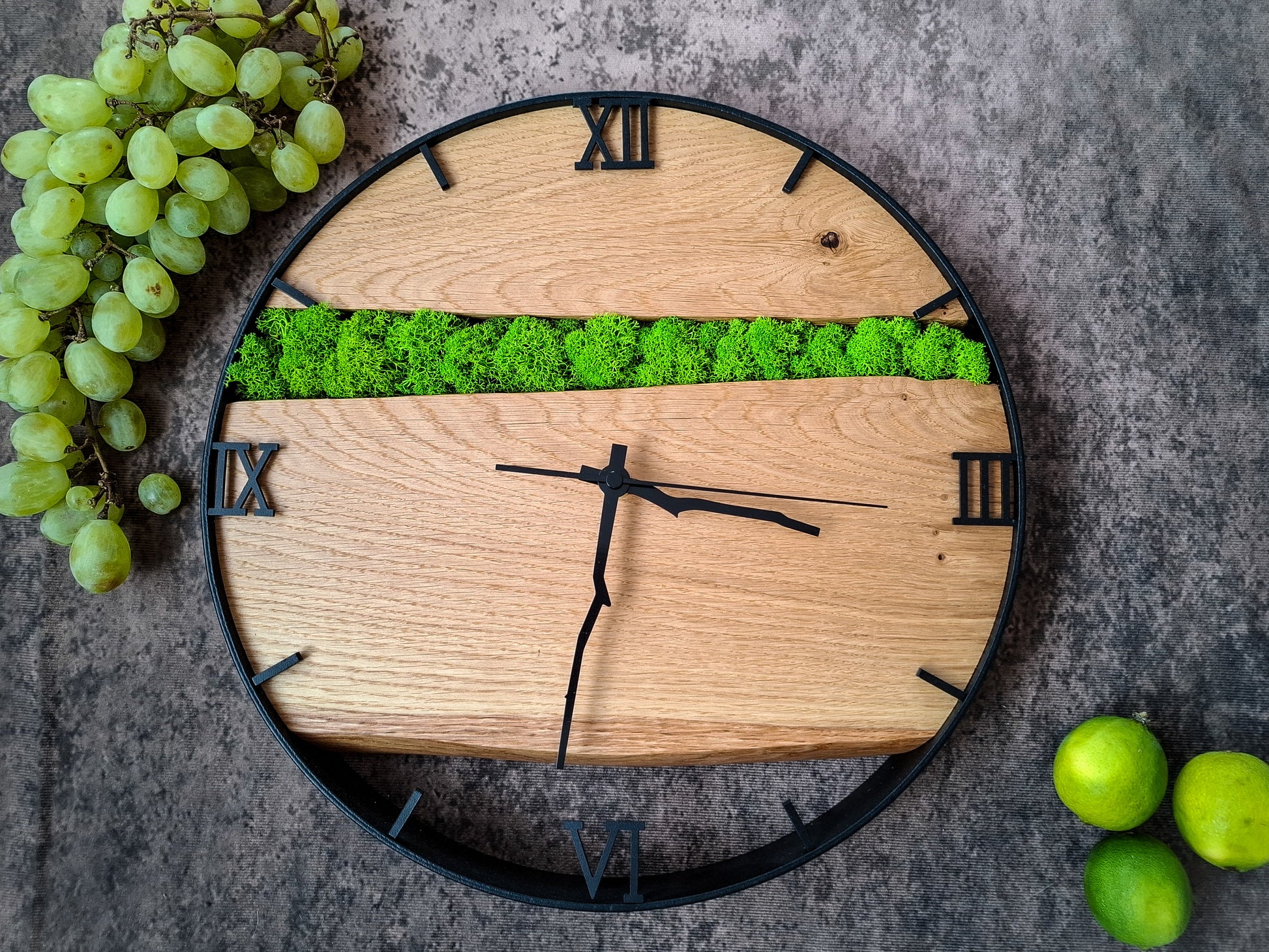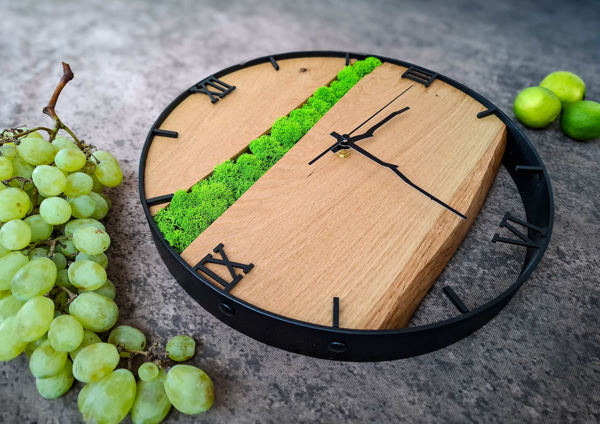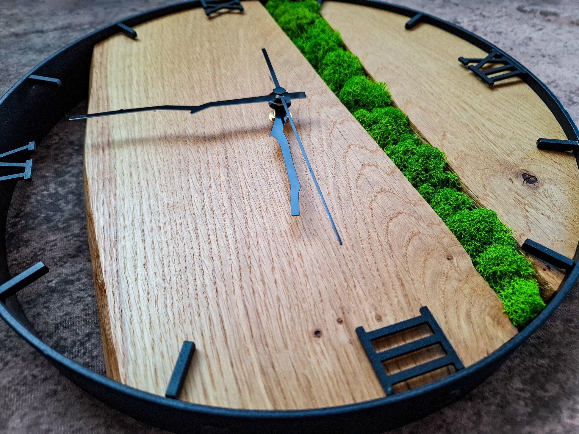 Eichenholz-Uhr mit echtem Moos in Metallrahmen
