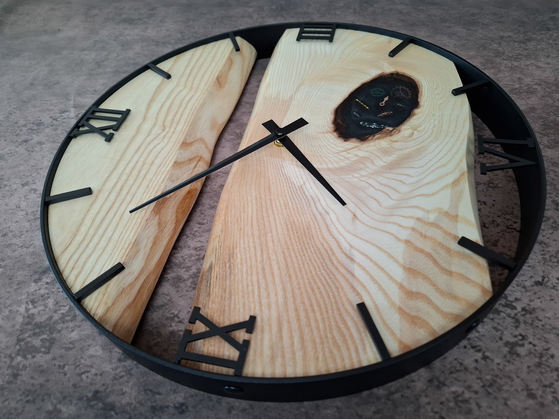 Diese einzigartige Wanduhr kombiniert massives Naturholz mit einem besonderen Detail: In einer Baumknoten-Vertiefung sind kleine Zahnräder und Uhrenteile im Harz eingegossen. Schwarzer Metallrahmen und römische Ziffern verleihen der Uhr einen modernen, zugleich rustikalen Look – ein echtes Highlight für jedes Zuhause.