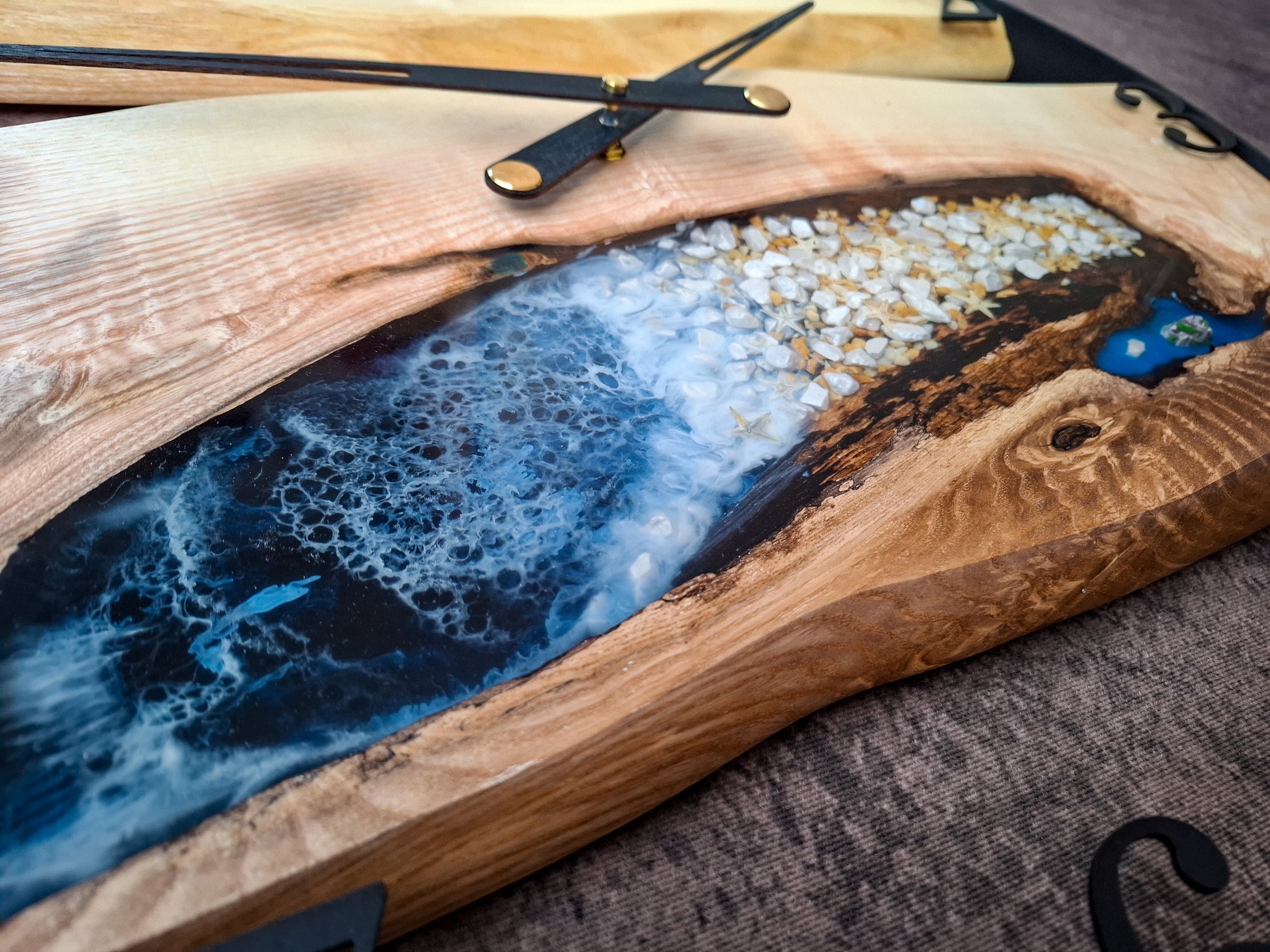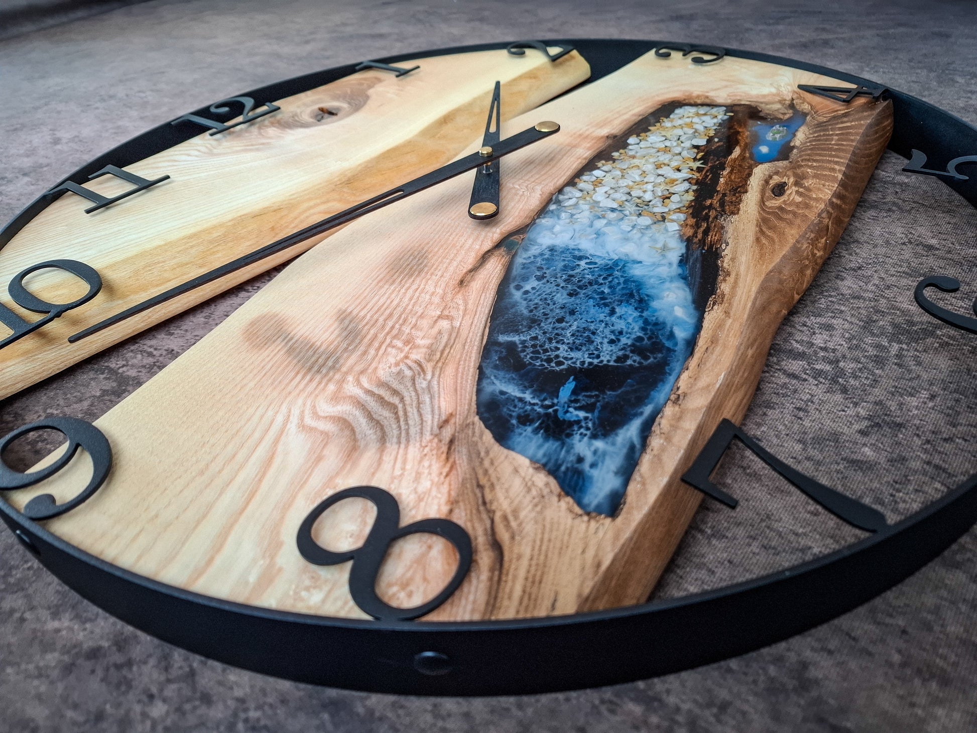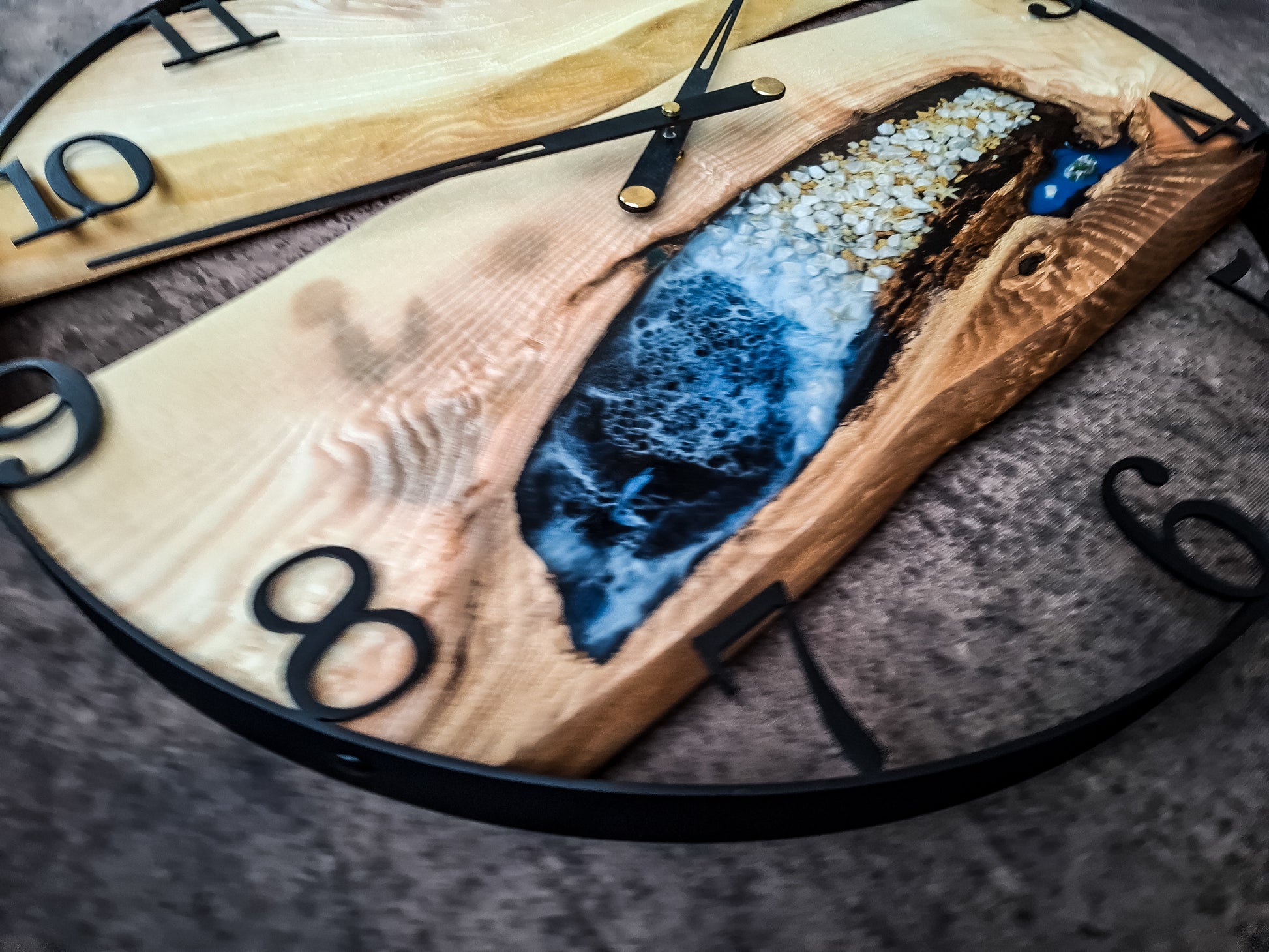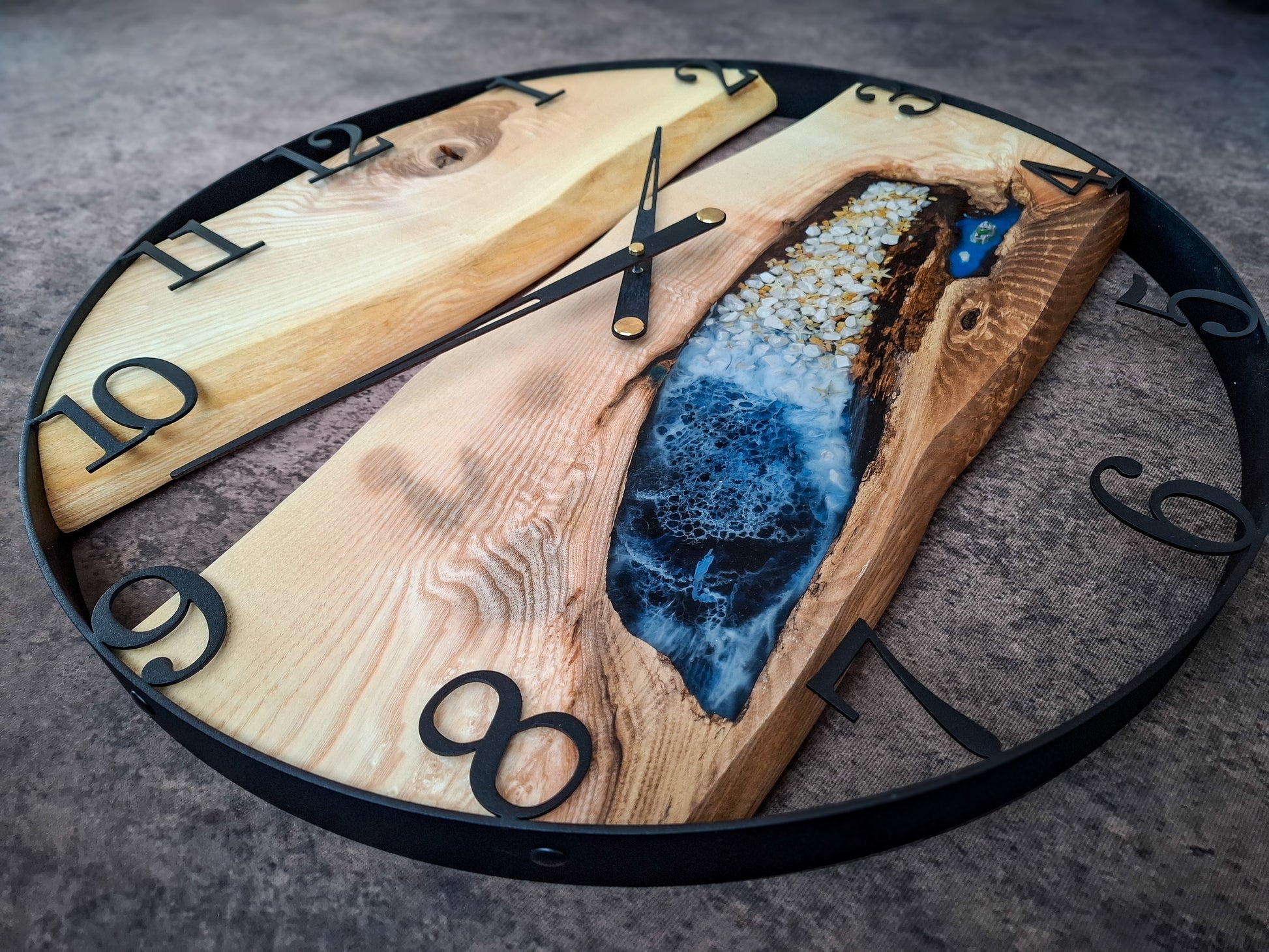 Diese handgefertigte Wanduhr verbindet natürliches Holz mit blauem Epoxidharz, das wie Meereswellen wirkt. Eingearbeitete Steine verleihen ihr einen einzigartigen Strand-Effekt. Der schwarze Metallrahmen mit filigranen Ziffern rundet das moderne und zugleich rustikale Design ab – ein dekoratives Highlight für jedes Zuhause oder Büro.