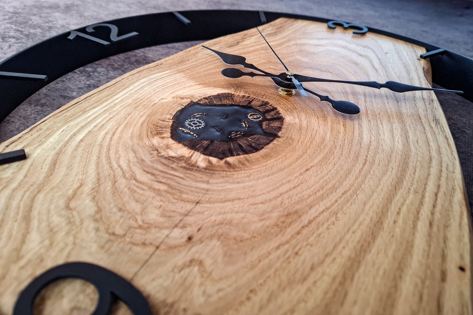 Handgefertigte Wanduhr aus massivem Holz mit schwarzem Metallrahmen und modernen Ziffern. Im Holz ist ein besonderes Epoxid-Detail mit kleinen Zahnrädern eingearbeitet – ein stilvolles Unikat für jedes Zuhause.
